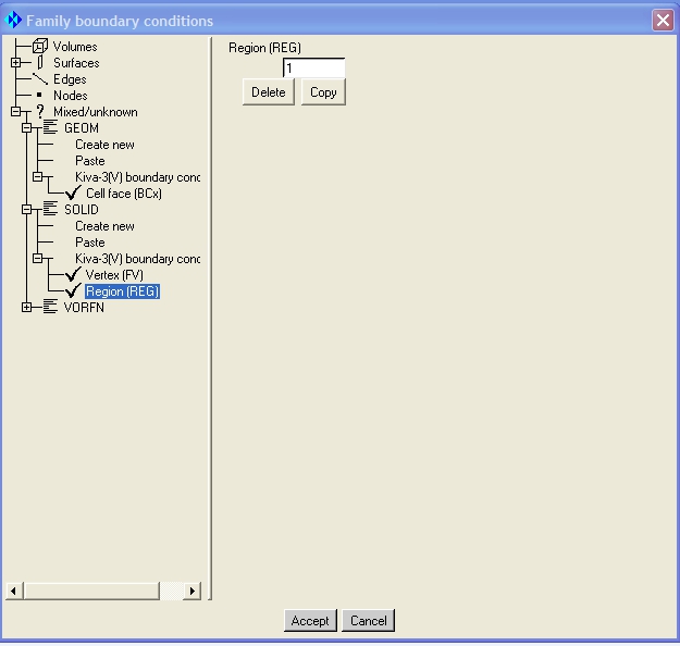 Click on boundary condition and a window will appear where it is possible to set all the necessary boundary conditions. For the family “GEOM” that includes all the walls specify the BCx 2.0, and for the volume family “SOLID” specify the vertex (FV) squish 4.0, idface notmoving (-1) and the Region (REG) 1.